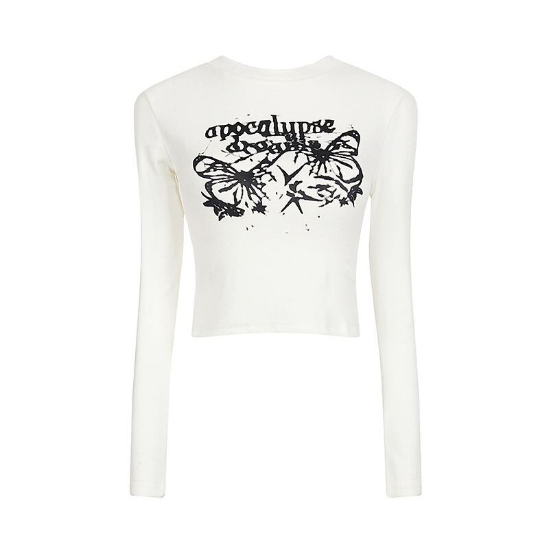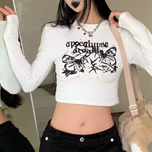カジュアル クロップドトップス バタフライ スリムフィット クロップド丈 へそ出し トップス Tシャツ ロップドTシャツ シンプル 長袖 Y2K 韓国ファッション レディースファッション Kpopファッション 韓国ストリートファッション 韓国ストリート系ファッション ストリートファッション ストリート系ファッション アイドルファッション SNS映え 個性的 トレンド 韓国通販 韓国ショッピング 人気 おすすめ